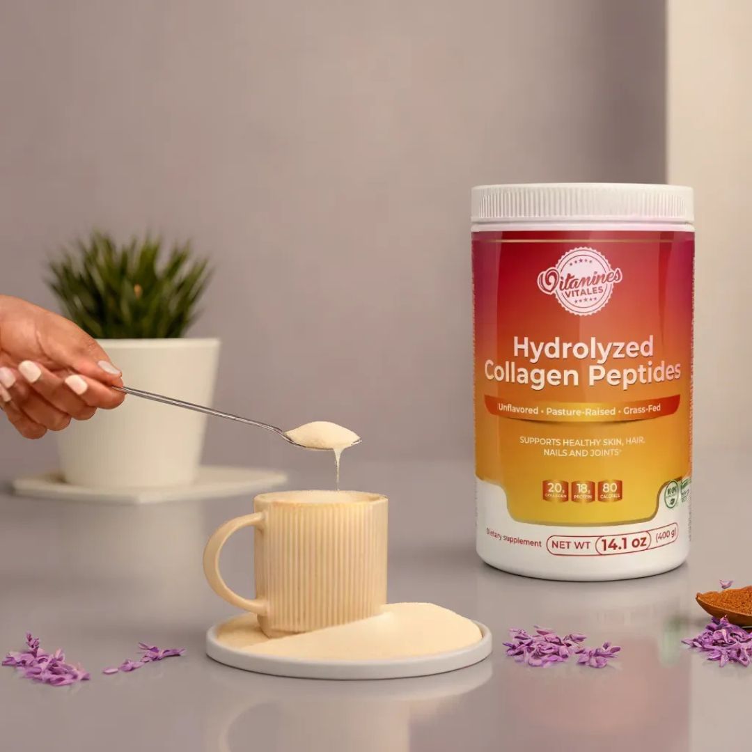 Vitamines Vitales Ⓡ combination of hydrolyzed types I & III Collagen Peptides are sourced from grass-fed, pasture-raised bovine and are hormone-free, 100% non-GMO and Gluten Free.